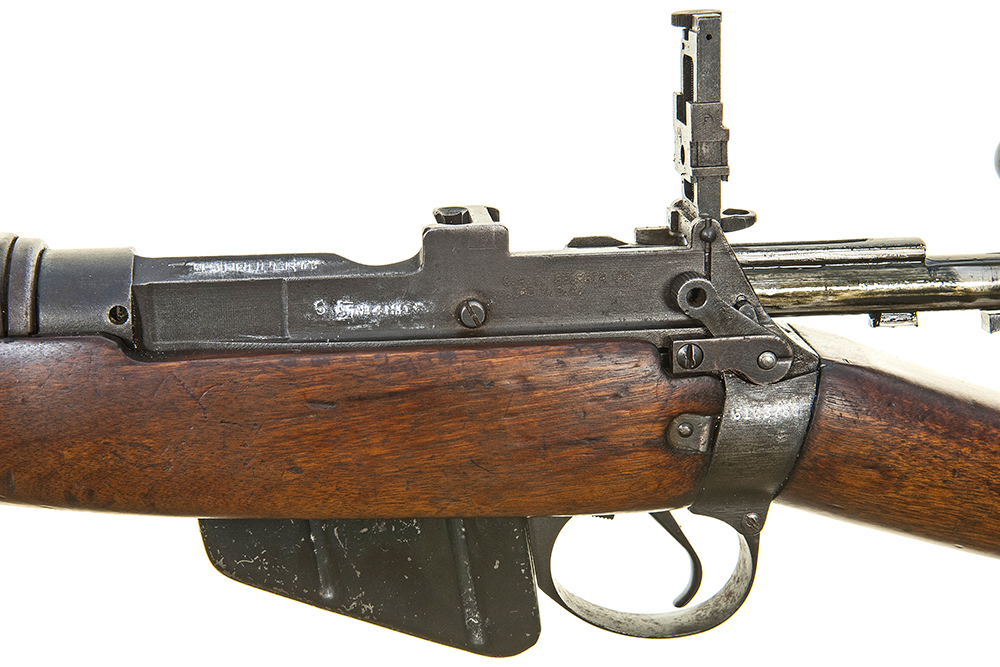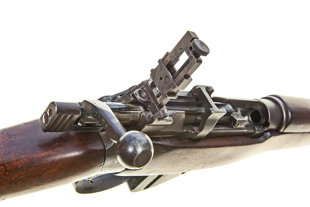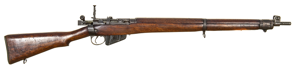 Excellent original condition. Very good bore and nice walnut woodwork. Wartime rear battle sight and single element safety replaced with post war ladder sight and two element safety.
