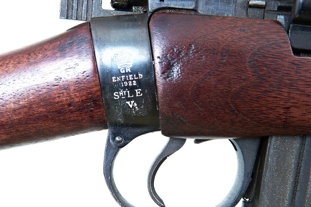Very rare 1922 Enfield SMLE Mark V. In beautiful condition with pristine bore and woodwork. Complete with magazine cut off. With its receiver mounted rear ladder sight and long sight base, this will be an excellent shooter.